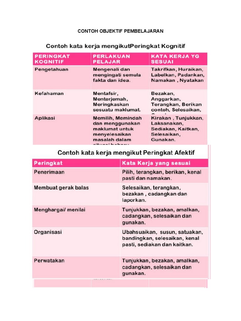 Hasilproduk pembelajaran ini perlu dapat diukur atau dilihat untuk dijadikan sebagai suatu bukti objektif pembelajaran berlaku pada pelajar-pelajar. KEMAHIRAN MEMBINA OBJEKTIF PENGAJARAN Definisi objektif Mengikut Kamus Dewan objektif ialah sesuatu yang khusus yang ingin dicapai matlamat tujuan1 Objektif pelajaran Objektif pelajaran ialah matlamat yang ditentukan berdasarkan kemahiran pelajaran supaya murid-murid dapat menguasainya selepas aktiviti pengajaran dan pembelajaran. Kedua-dua elemen Pengajaran dan Pembelajaran PdP ini tidak lagi menjadi rahsia dan.